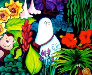 I’m not sure why I chose the jungle as the backdrop to my first Norm. I’ve always been drawn to the idea of a jungle, as I have been to forests with their dark creepy corridors between trees, naturally sheltered by the canopy of vast tree tops and low hanging luscious flowers and furry palms. I think I can identify two sources of inspiration for this fascination. Firstly the stories of the Moomins written and illustrated by Tove Jansson which I was obsessed with as a child. Through her vivid descriptions and beautiful illustrations, she really conjured the idea of a magical midnight forest, full of little creatures hiding under the trees, each plant and crag and corner being imbued with a sense of mystery and adventure.