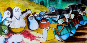 As my regular readers will have twigged, I’m a big fan of Spanish art, and therefore it is no surprise that somewhere in the dark depths of my imagination, a Norm version of Goya’s magnum opus would take its form, emerging as a brief watercolour sketch the other night. Here it is, with Goya’s original masterpiece.