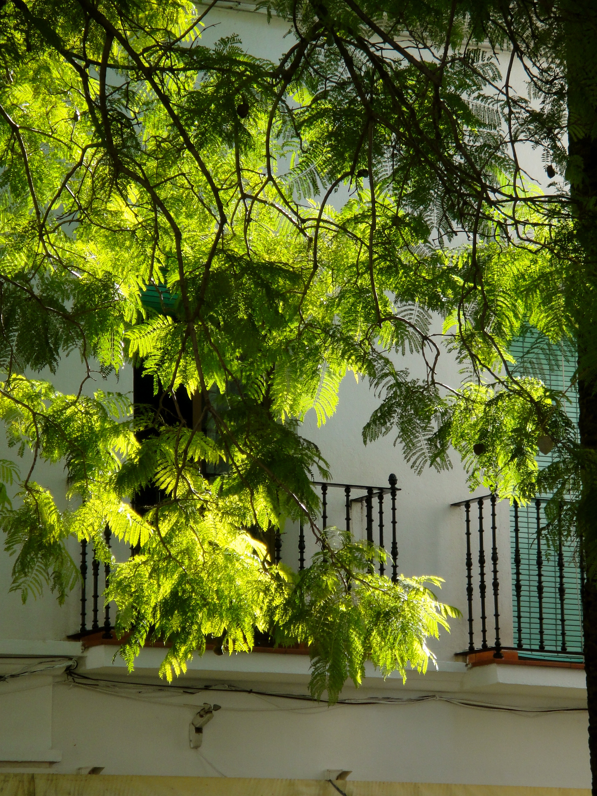 Greenery reflected in traditional balcony shutters