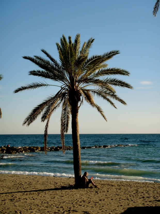 Sole reader rests by a palm tree