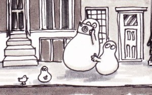 When I don’t have time to paint, I try to sketch – at least once a day. I used to sketch a lot in my diaries which I have been keeping for 16 years. I still do in fact. But nowadays, my priority is to sketch on little cards which I hope one day to exhibit as a whole, or at least hang them collectively in my hall. In a week which may well include a few sketches (time permitting), I’m reliving last week’s Amsterdam trip through my Norms, keen not to let go of the memories of that trip which remain so strong and leave me caught in daydreams throughout the day, thinking of clogs, and canals, and those pesky cyclists. Here are Norms visiting Amsterdam. Now I’m going to ponder how a Norm would wear clogs. More on that later in the week.