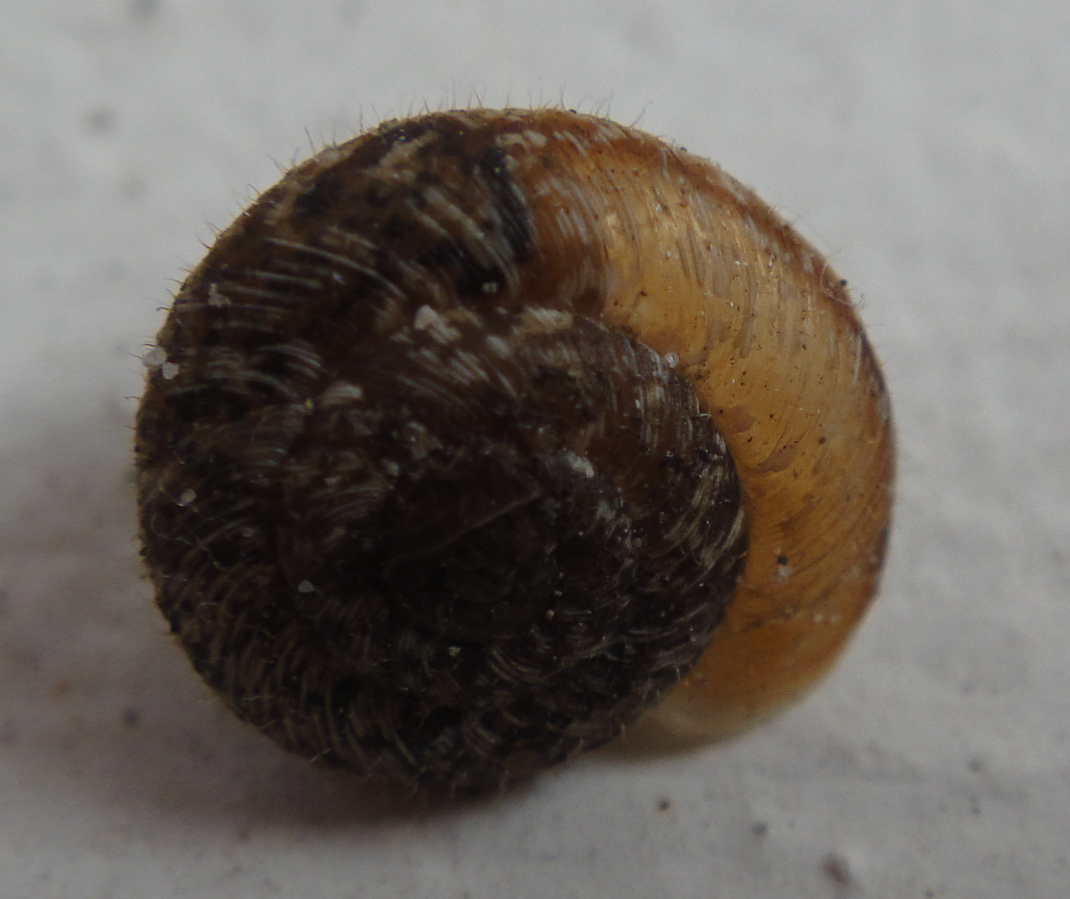 A minuscule (4mm across) baby snail shell, with tiny hairs across its surface
