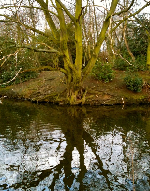 Wonderfully green tree roots twist near a pond in Wandsworth Common, London