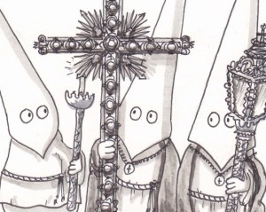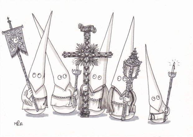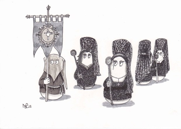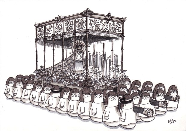 It’s Holy week around the world, and very much Semana Santa week here on The Daily Norm as myself and the Norms celebrate the lavish spectacle that are the Spanish Easter festivities. From photos and paintings, to sketches, today the Norms put in their two pennies worth indulging in their very own Semana Santa celebration. Thus a great body of costaleros share the burden of the vast tronos upon which a canopy contains a statue of a weeping Mary, surrounded by candles, lanterns and flowers. Here too, a group of Norms dress in the capriotes of the nazareños, carrying the typically opulent accessories of the procession – ornamental lamps, candles sticks and a magnificent crucifix. In the meantime, a group of female Norms adopt the black laced mantilla and accompanying black laced outfit worn by female participants of the parades.