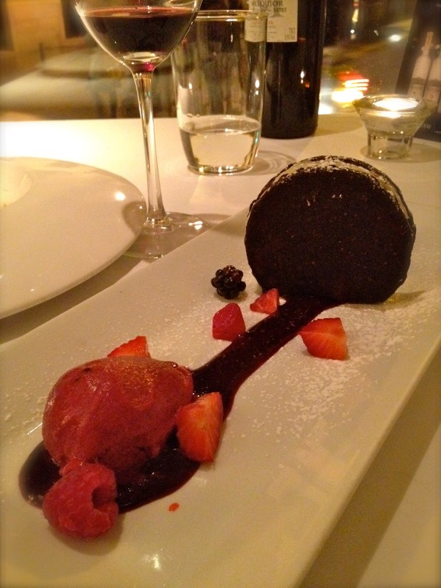 Finding Lateral to be, predictably, pack out with queues stretching well into the buzzing Plaza de Santa Ana, we headed a few blocks down the road along the Calle del Prado, where we stumbled upon Va de Baco at 4 Calle del Prado 28013. The restaurant is seemingly quite new, decked out with chic lighting and cabinets brimming full of wine. But the real star was the food. To start we were given a free aperitif which comprised a consommé style soup in which well-seasoned chickpeas bobbed gracefully, while on the side a super-creamy jamon croquette added some texture to the dish. Moving on to the tapas we ordered: simple, traditional favourites such as Ensaladilla Rusa (a mayonnaise-based potato salad with tuna a crunchy vegetables) and albondigas (meatballs) were served with contemporary twists such as the creamy curry sauce of the albondigas. More adventurous was a tapas of spider crab, delicately served with a potent wasabi mayonnaise, while the real star of the night was a ginger cream dessert with slices of mandarin and a passionfruit sorbet accompanying – exquisite. And best of all, the final bill, including a large carafe of Rioja plus two glasses extra at the end of the meal, was a mere €45 for the two of us.