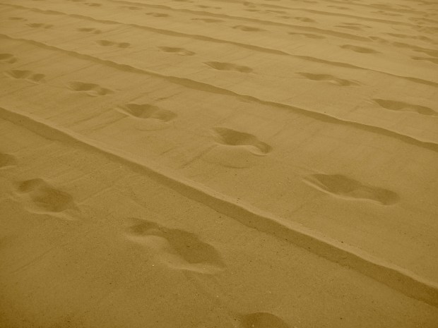 Perfectly raked sand but with the unavoidable footprints of the raker