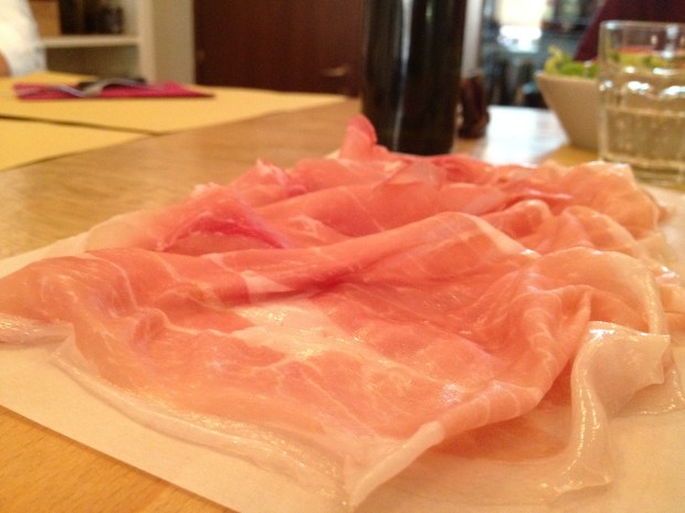 Next, lunch. We stumbled upon this place, Banca del Vino (Via Mantana), on the outskirts of the rough and tumble of Bologna’s ghetto. Here the pizza was amongst the best I have had in Italy. So fresh, so thin and crispy, with a plate of soft silky parma ham served on the side, so that it could be added to the richly endorsed buffalo mozzarella pizza at will. In the meantime, my partner sampled the delights of an equally fresh, thickly cut home-smoked salmon, with a palate-pleasing glass of local white wine on the side. This was rounded off with a rich chocolate parfait with accompanying white chocolate chunks.