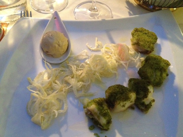 Our second dinner was at the Ristorante Ciacco (Via San Simone), another off-street secret which we stumbled upon having escaped the more tourist-focused affairs of the central Piazzas and cheaper offerings of the university quarter. Here we were treated to an innovation of ice cream, as almost every dish was served with some form of welcomingly-cool ice cream accompaniment. With my warm foie gras, an ice cream flavoured with orange and thyme provided both a sweet and sharp contrast to the rich meaty flavour of the foie, while my partner’s starter (a prawn and scallop club sandwich) was similarly accompanied with an ice cream of wholegrain mustard. For main course, I was treated to a dish of monkfish with liquorice flavoured ice cream – while the monkfish was, inevitably, a little lacking in flavour, the liquorice gave a punch to the dish, helped out in this objective by a light salad of finely sliced fennel. Unsurprisingly, there were innovative ice creams aplenty on the dessert menu, but we instead opted for a white chocolate parfait, accompanied by a vivid green fresh-mint coulis.