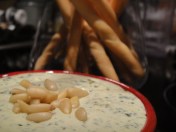 Such an easy treat, but this one went down the best. Simply wrap one end of some Italian grissini (bread sticks) with proscuitto or parma ham. For the dip make some pesto – I wizzed up half a clove of garlic, four large handfuls of fresh basil with a handful of lightly toasted pine nuts and the same amount of freshly grated parmesan, a good dose of salt and enough olive oil to loosen up the mixture once blitzed in a mini food processor – there’s nothing quite like the smell of freshly made pesto to evoke the pleasant green lands of Roma, picnicking outside the Coliseum – and that was my pesto. I only used about 2 heaped tablespoons of this, adding those to 300g of soft cheese and there was my dip – creamy, with the exquisite flavour of the mediterranean.