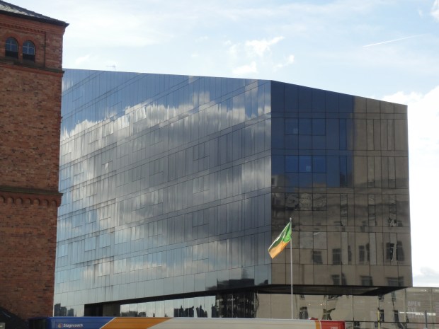 Reflections in the vast facade of a contemporary apartment block