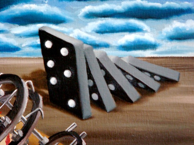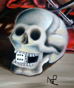 It was tapping into the great pathos portrayed by La Pieta that I chose to reflect the pose in my Mother, cradling me, the wounded young adult in her arms, not dead, but so close to it as I practically embraced my end under the weight of a crushing collapsed 10ft concrete wall. There too is my baby nephew, born only a few days before the accident, representing both innocence and the cross-generational effect of my trauma, and also in the scene, a skull, reminding me of how close to death I came. The playing cards, the falling dominoes and the dice all go to represent the great gamble we take every day of our life – when everything appears normal until one, life-changing event occurs and alters everything for ever: Look then how the dominoes will fall and the effects of the event begin to traverse every facet of your existence.