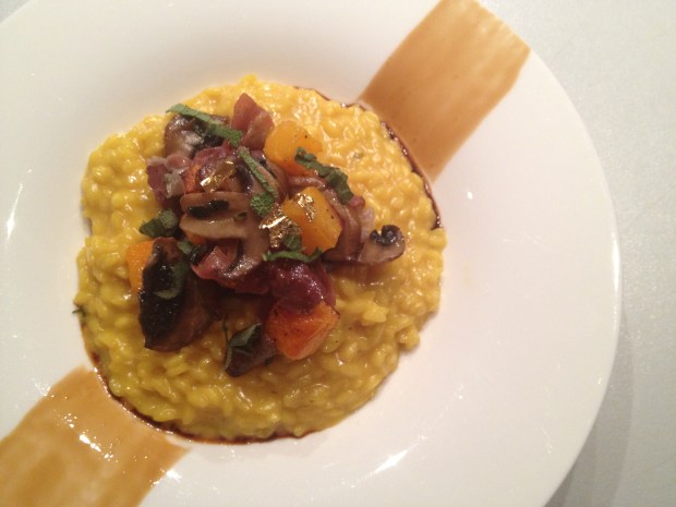 Saffron Risotto with a gathering of autumn flavours, edible gold leaf and an espresso reduction