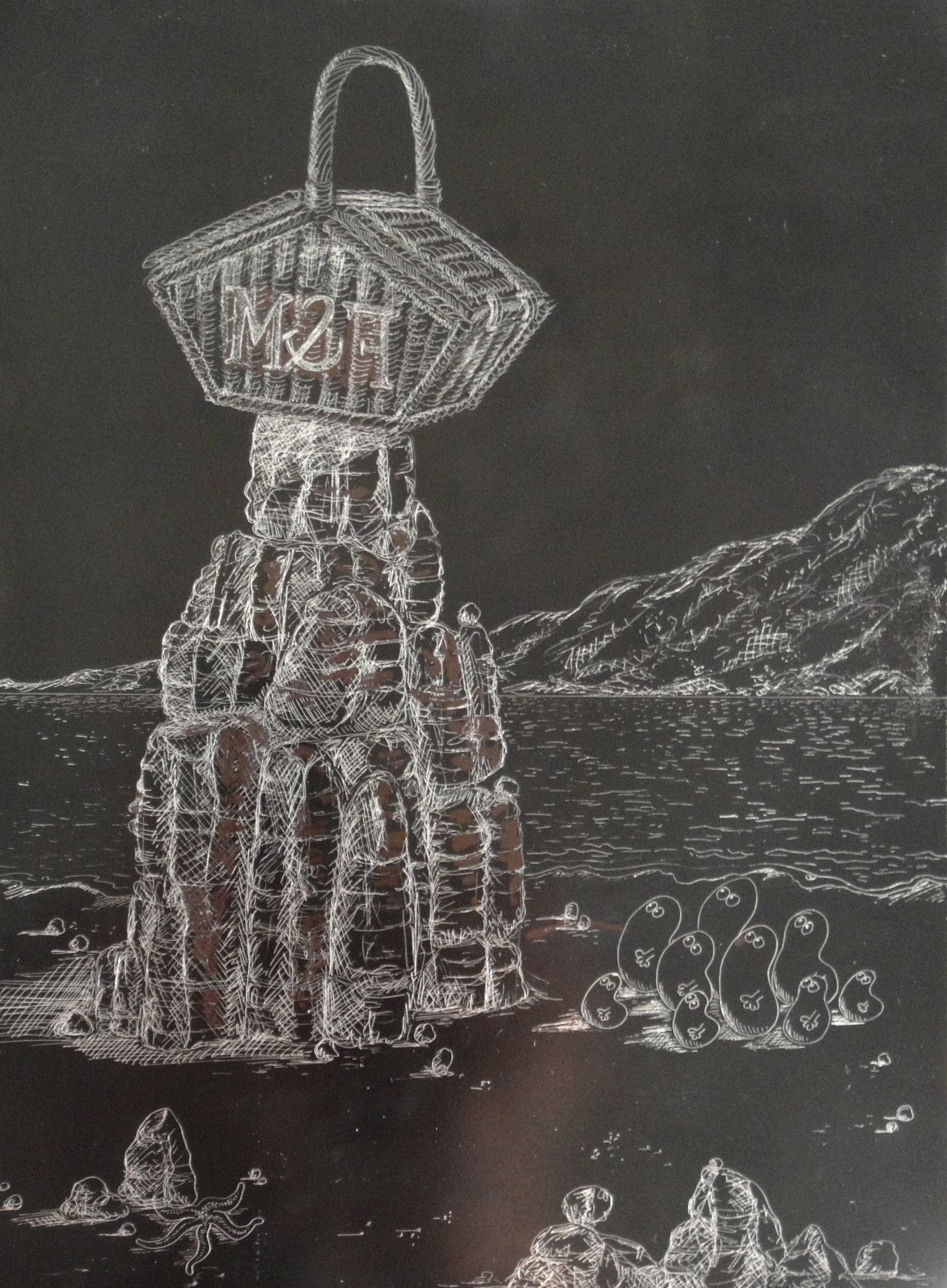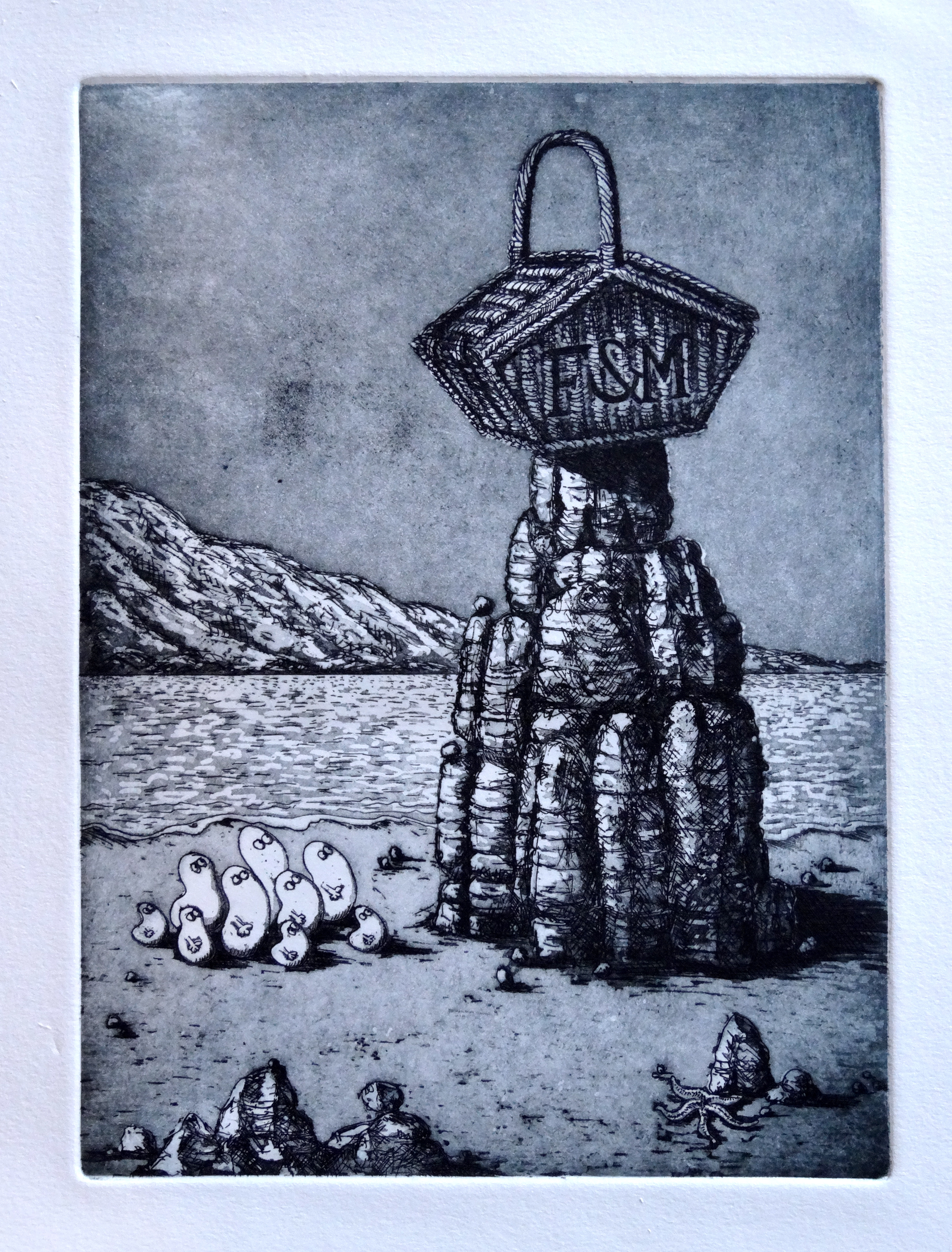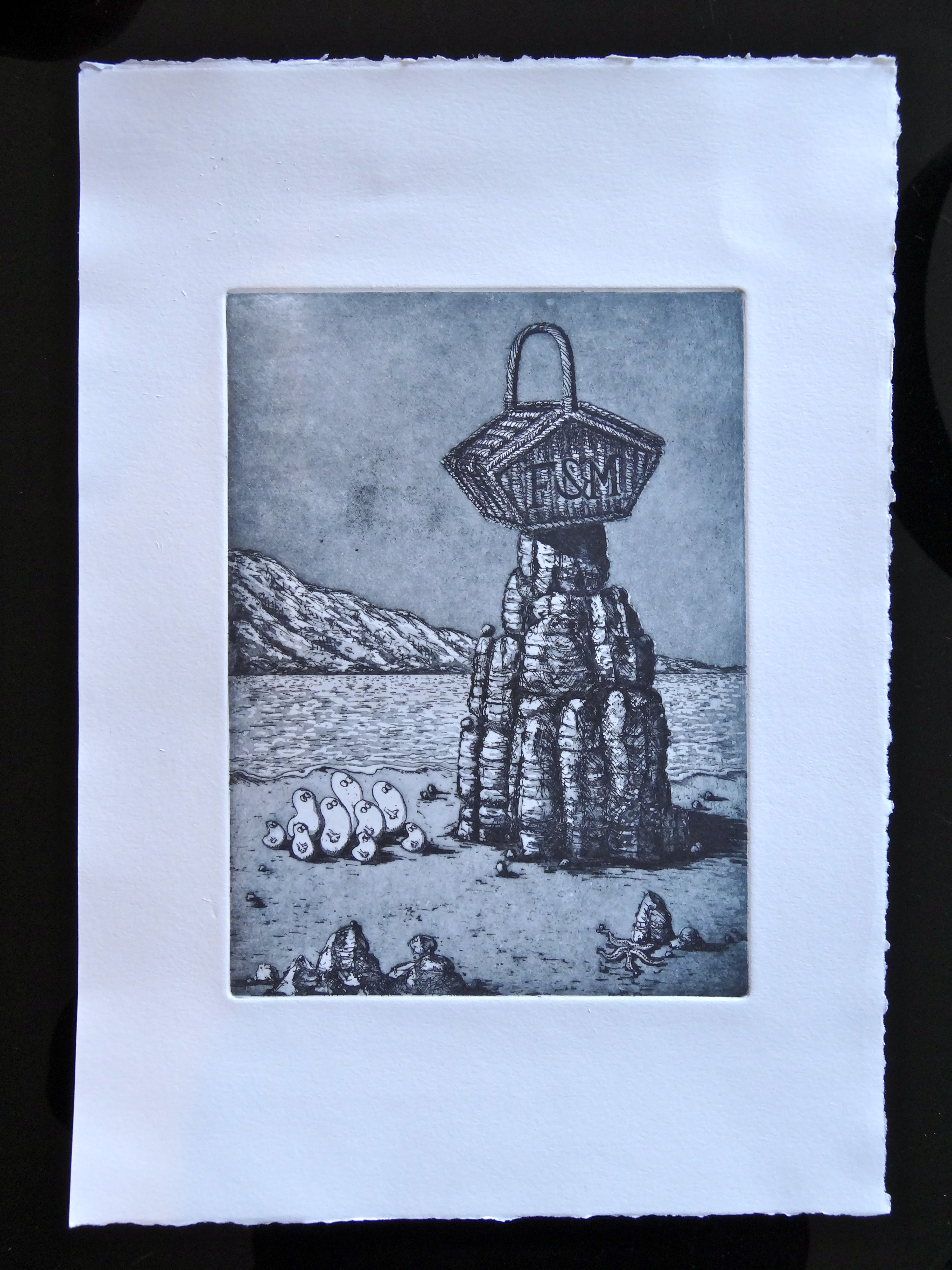 Being a self-trained artist, and so lacking the basic overview which art college provides of the many mediums which an artist has at his or her disposal, I became so entrenched in the world of painting for so many years that my recent discovery of the world of print has come as a complete revelation. Now over midway through an intermediate course in etching, I have taken to the medium like a duck to water. For not only does the medium transfer all of the skills of draughtsmanship which I have been mastering over the years in painting and more recently sketch, but through the sheer narrowness of the needle upon ground it enables me to pack the kind of detail into my etched images that I love. So, in my now advanced second etching, of a Fortnum and Mason’s hamper balanced upon a craggy rock, I have been able to go to town on the detail of the wicker, the rock texture, the little Norms looking up at the rock and the mountain and sea in the background.