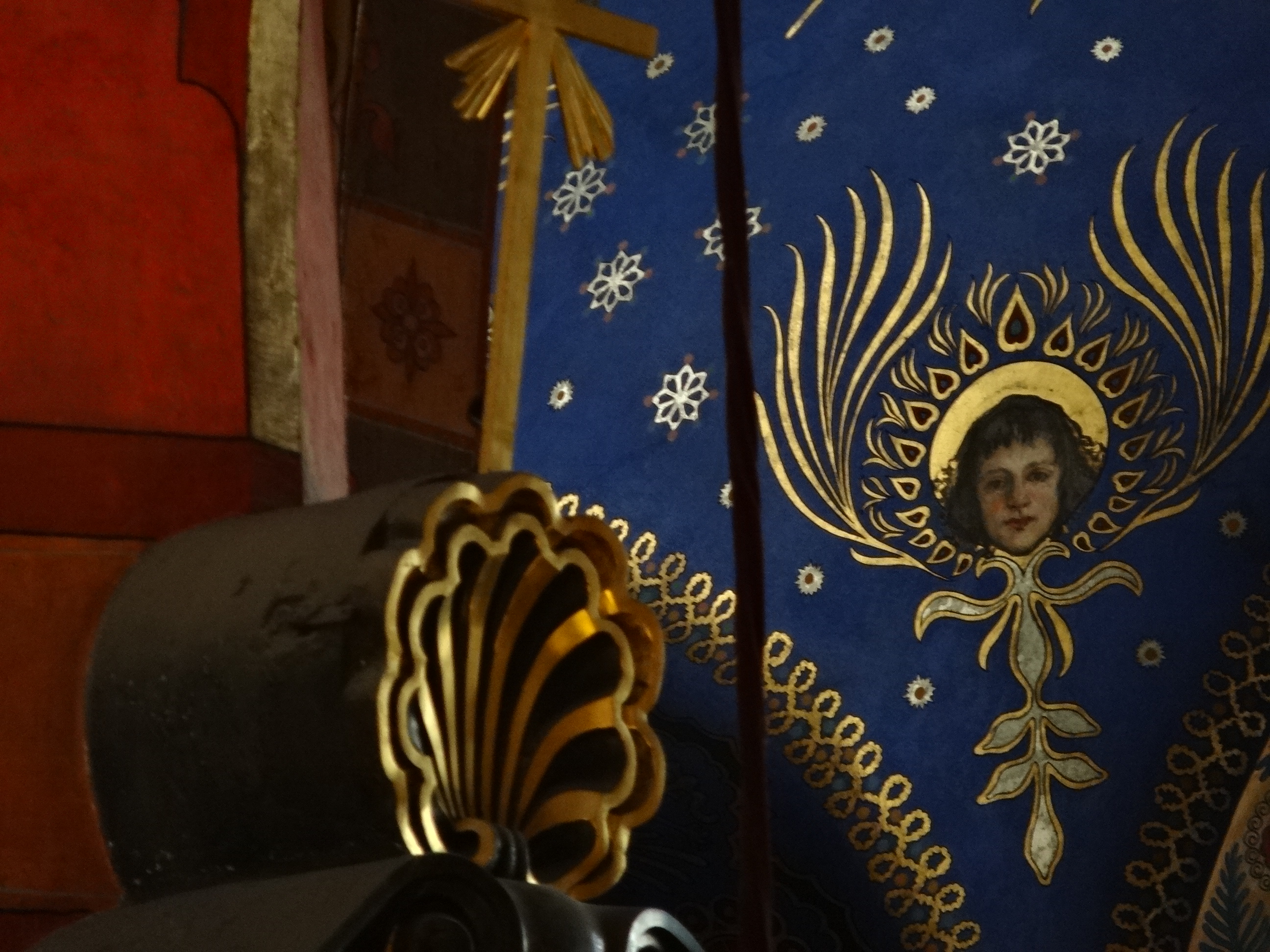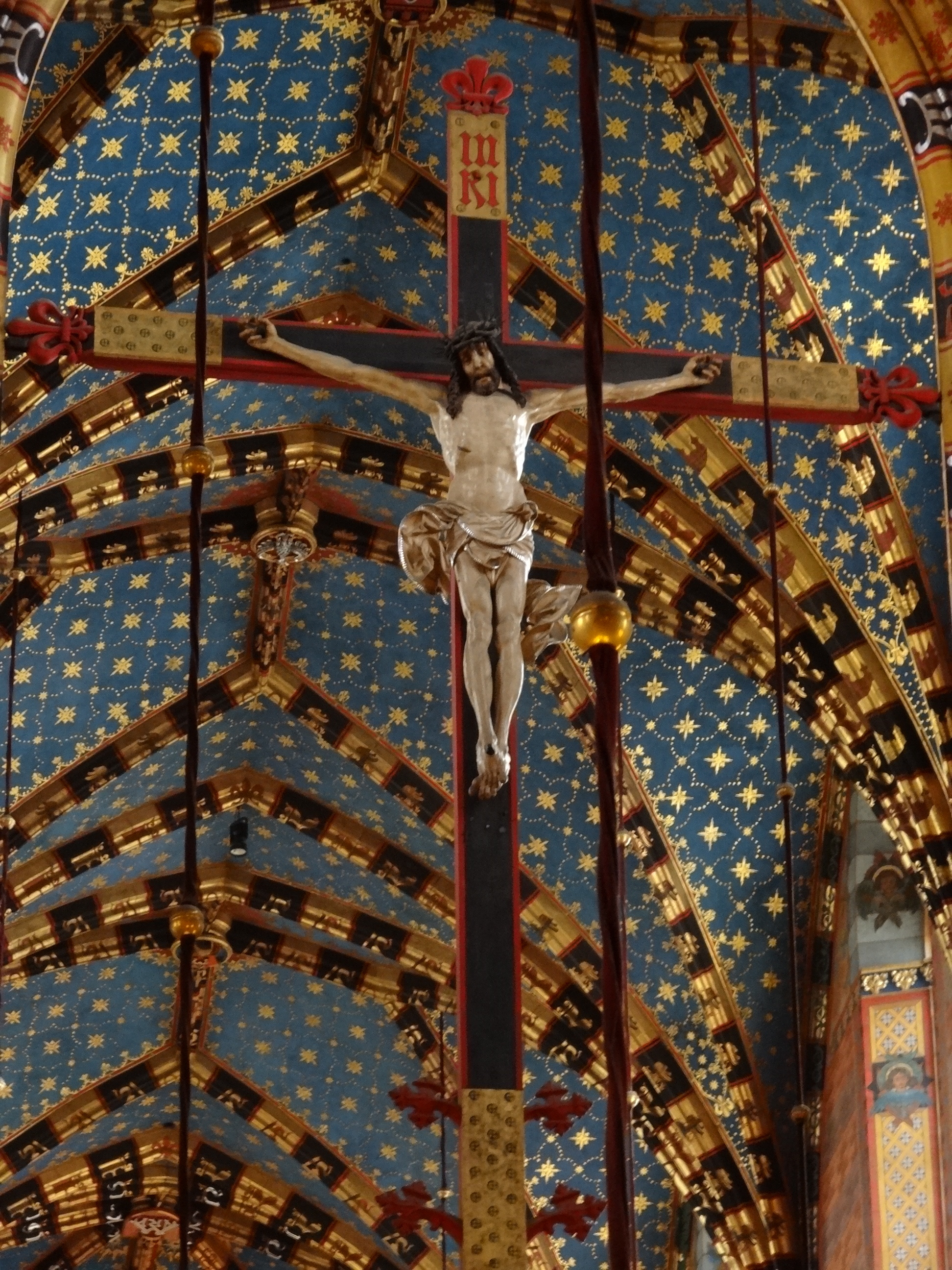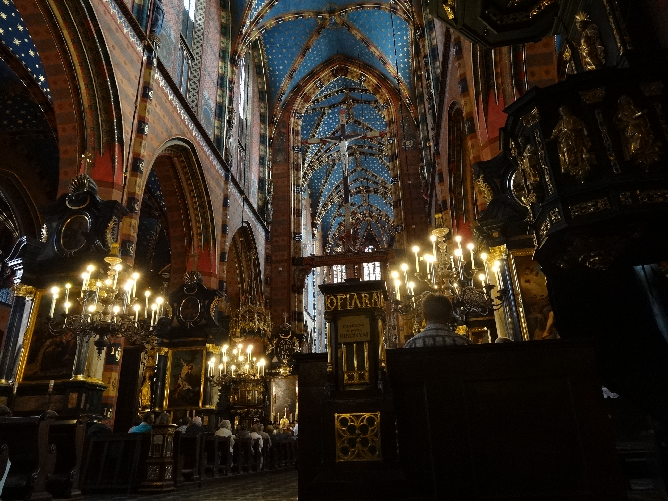 But within that view and outwards into the city beyond, there remained much to see before we faced the inevitable flight home. First up was to head inside the centrepiece of the square which, up until now, I had only gazed at longingly from the outside. The Mariacka Basilica is a masterpiece from the outside; its gothic spire topped with majestic spiked crown completed with golden balls and glimmering details. But the majesty does not end there. The inside of the church is a thing of such splendour that it cannot fail to take your breath away. The gothic architecture, so often left austere, has been painted a rainbow panoply of colours – in between red and green striped ceiling ribs, the stone vaults sparkle with golden stars set within a midnight blue sky; on the walls and columns, every surface is painted with rich patterns and interlaced with more sparkling gold; and through the colourful stained glass, light gleams and glimmers in the space, bringing the multi-coloured abundance of colourful décor to life. The most annoying thing of all was the ban on photography – but as you can see, that went somewhat ignored, as I began photographing surreptitiously (hence the rather questionable quality of the shots!).