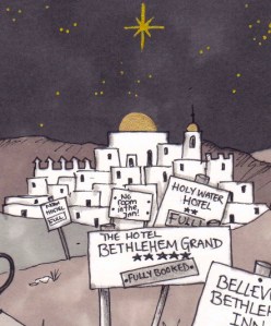 So over hostile terrain they travelled for days, their worldly possessions, and the heavily pregnant Mary Norm pilled upon poor Nancy’s back, trekking across dessert and wide open plains until finally they could see the little town of Bethlehem glittering like a mirage in the distance. But their relief was short lived, for no sooner had they made out the outline of the city than they had caught sight of various road-side advertising posts advertising hotels and inns – yet all of these adverts bore the ominous news that all of the accommodation was booked up! (Well, it was Christmas I suppose…) What would Mary Norm and Joseph Norm do? Find out… next time!
