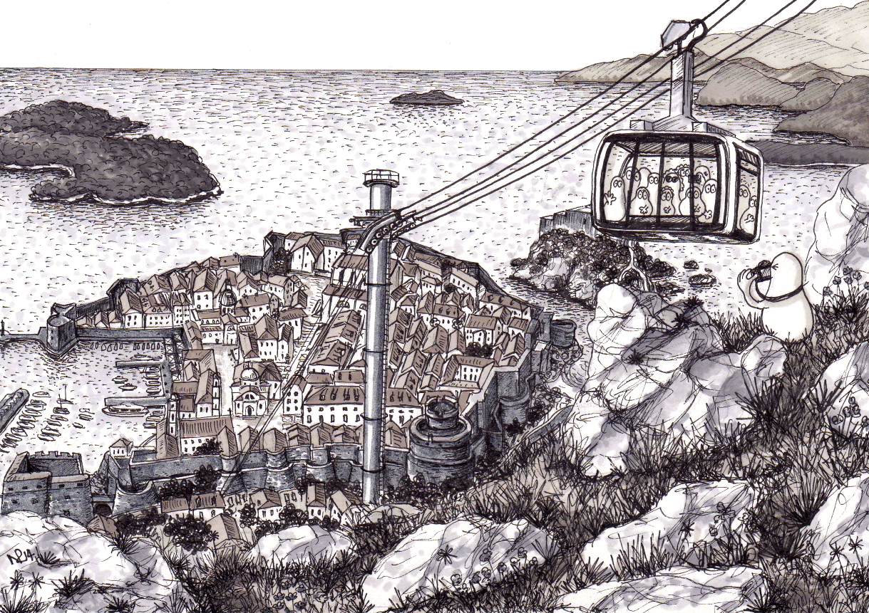 Norms in Dubrovnik take the Cable Car (2014 © Nicholas de Lacy-Brown, pen and ink on paper)