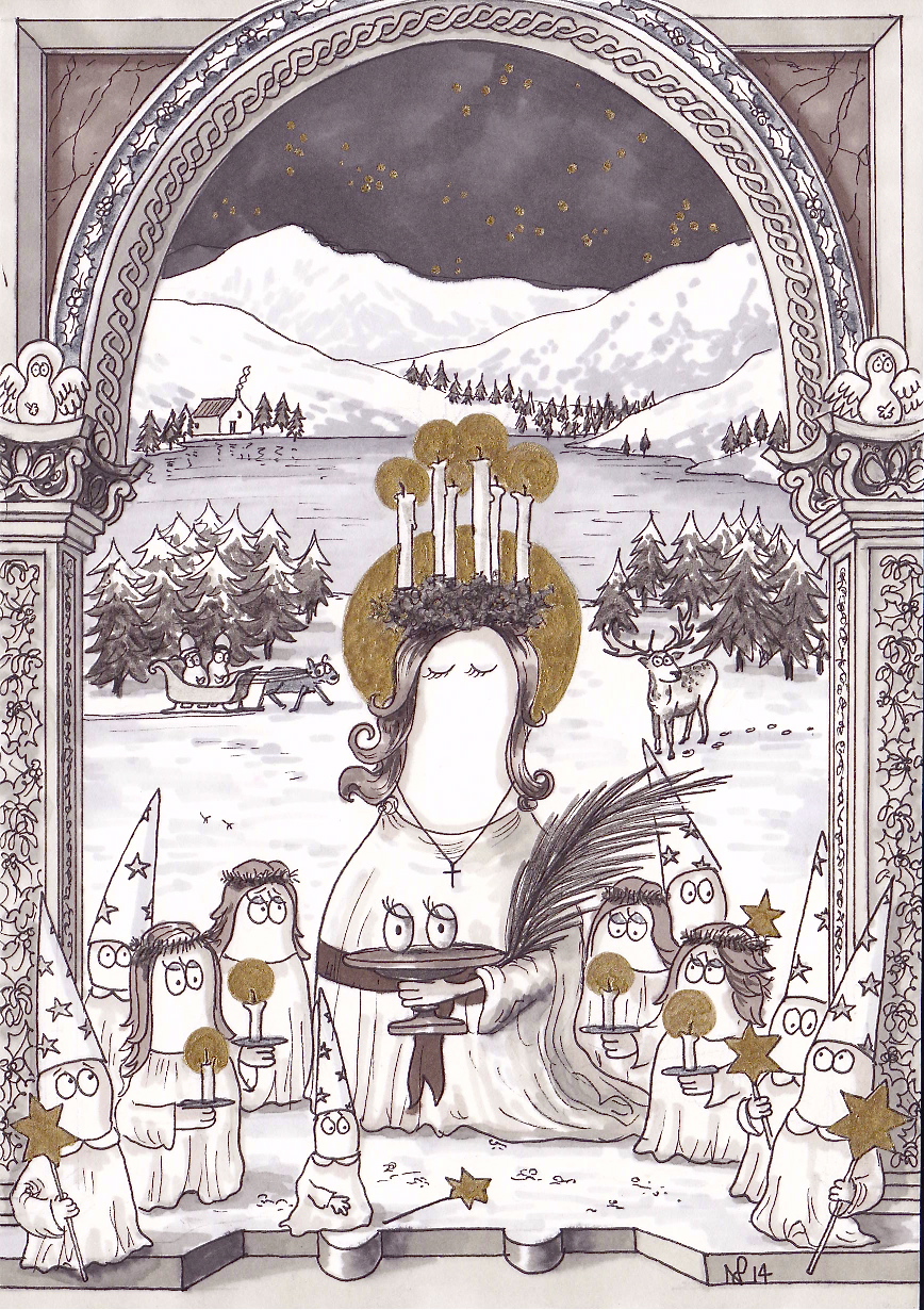 And so, here is Santa Lucia Norm, depicted in all her glory with eyes upon a platter. No gruesome gouging here (it is Christmas after all), but just the suggestion of it. My Santa Lucia is wearing the crown of candles which is worn by celebrants of her festival in the Scandinavian celebrations which are the basis of my depiction. Those celebrations also include choirs of children wearing white gowns, conical hats and carrying candles in homage to the Saint’s light-giving powers – celebrations which are depicted here against a snowy, Christmassy Scandinavian landscape. More about those celebrations tomorrow, but in the meantime – a Merry Christmas to all!