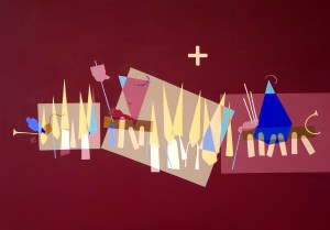 Featuring all of the various characteristics of the parades; the pointed hats of the nazareños, the enthroned statues of Jesus and Mary, the candles, trumpets and incense smoke, this new painting encapsulates Semana Santa, with each aspect reduced into an abstract form typical of my new style, and with a highly limited colour palette of deep blood red, yellows and touches of blue.