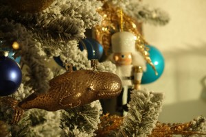 Replacing the annual real tree whose needles played havoc with my cream carpets, this year we have introduced a new 7ft snow sprayed false tree adorned with warm lights and begging for the fake polar-bear throw which is wrapped around the base of the tree and provides a wonderful soft landing for all those gold and white presents. On the snowy white branches, I added golden fern leaves for embellishment, and thus set the scene for my favourite ever set of decorations: an abundance of whites and golds and blues of every shade, all in homage to the glory and opulence of a Russian Christmas.