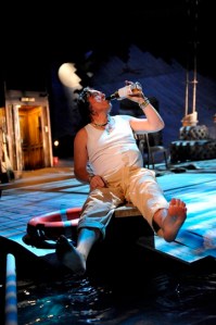 The best part of the set however has to be the pool filled with real water at the corner of the stage. It is from this pool that at the most unexpected moment, both Viola and a little later Sebastian, the shipwrecked protagonists of the play, emerge, gasping for breath, in the most fantastically realistic staging of a shipwrecked twosome. After this initial use of the pool, that same watery expanse is not forgotten. It provides the backdrop for some brilliant slapstick comedy by the likes of Bruce Mackinnon as a fantastically dippy Sir Andrew Aguecheek, and is a suitable space into which the phlegmatic Olivia can discard the unwanted gifts given to her by love-struck Orsino as she shuns his many indefatigable advances. True, the first few rows of the audience did get relentlessly splashed as the pool slowly emptied upon each dramatic entrance and exit by the actors, but at least they can’t moan that the play isn’t inclusive.