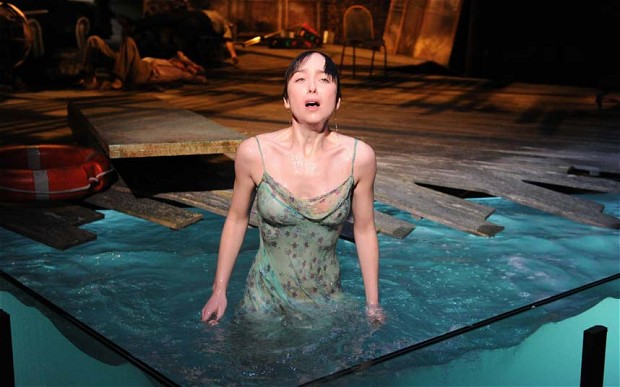 First off, the scenery. It’s brilliant. How to stage Twelfth Night, which on paper is part set in Orsino’s palace, part set in Olivia’s and part set on a beach? Well David Farr and designer Jon Bausor came up with an original solution. They set the play in a rickety old hotel, reminiscent of Fawlty Towers age hostelries, with a rattling old lift, swing doors, a dusty set of pigeon-holes containing all the room keys, and old-style air con in the form of a single fan with ribbons attach so that they flicker limply in the air whenever the fan is switched on. This hotel setting is in turn amalgamated into a sweeping curved wooden floor, which at the foot of the stage dips limply into a pool of water before curving across the stage into a steep incline at the back of the space, upon which a bed, a bath and other paraphernalia hang steeply suspended, and over which the darting shadows of a ceiling fan spin and flicker. In short, there isn’t a straight line anywhere on the stage, and this gives the set a dilapidated charm perfect for the 70s/80s reinvention.